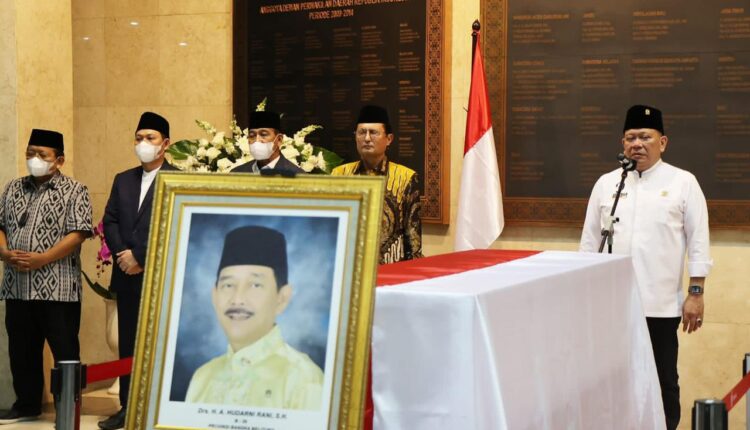 JAKARTA – Ketua DPD RI, AA LaNyalla Mahmud Mattalitti, memimpin pelepasan jenazah Achmad Hudarni Rani, anggota DPD RI asal Provinsi Bangka-Belitung, Jumat malam (8/4/2022).