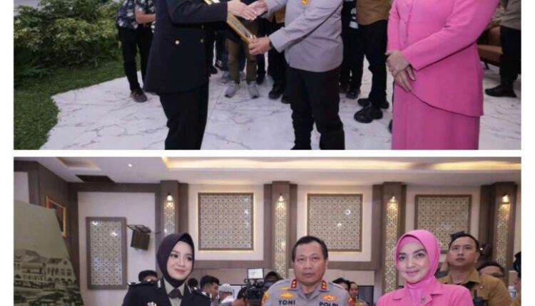 Surabaya, LNM – Kapolda Jawa Timur Irjen Pol Dr Toni Harmanto, bersama Ketua Bhayangkari Daerah Jawa Timur, Yesika Toni dan didampingi Pejabat utama (PJU) Polda Jatim, memberikan penghargaan Pin Emas dan Piagam Penghargaan kepada Briptu Tiara Nissa Zulbidah, di Gedung Mahameru, Mapolda Jatim, Jumat (4/8).