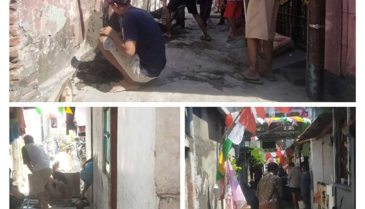 Surabaya, LNM – Gotong Royong menyambut HUT RI Ke-78 warga Kedung Klinter Rt/Rw 02/03 Kelurahan Kedungdoro, Kecamatan Tegalsari, Surabaya, kerja bakti, penambalan jalan rusak berlubang, pengecatan dan pasang umbul-umbul, pada Minggu (06/08/23) sekira pukul 07.00 Wib.