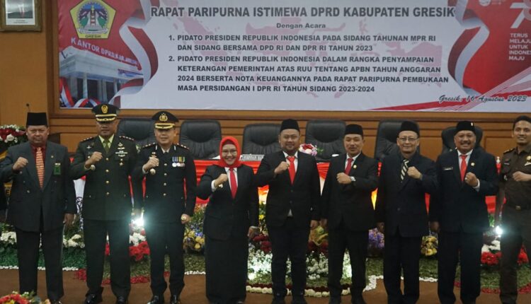 Selesainya mengikuti Pidato Kenegaraan Presiden RI secara virtual, unsur Forkopimda Kabupaten Gresik menutup kegiatan dengan foto bersama.(rama)