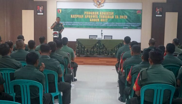 Gresik, LNM – Siap mewujudkan ruang, alat dan kondisi juang yang tangguh serta membantu pemerintah daerah dalam mendorong percepatan pembangunan dan meningkatkan kesejahteraan masyarakat, Kodim 0817/Gresik menyelenggarakan program peningkatan kemampuan teritorial (Katpuanter) Aparat Komando Kewilayahan (Apkowil) yang dibuka oleh Pjs.Kasdim 0817/Gresik sekaligus Danramil 0817/04 Menganti Kapten Inf Imam Su’udi di Aula Makodim 0817/Gresik Jl. R.A. Kartini No.33 Kabupaten Gresik. Rabu(13/9/2023).