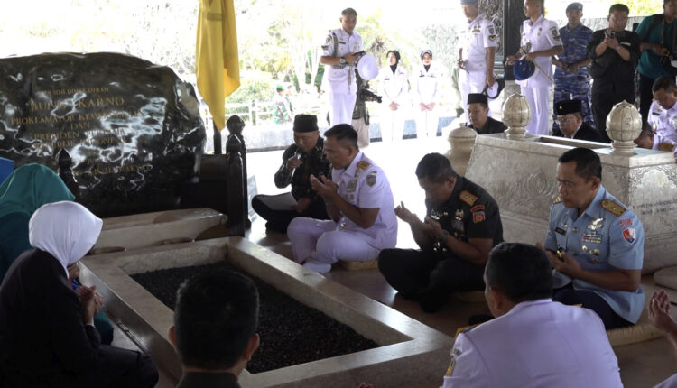 Surabaya, LNM – Membawa misi semangat Hari Ulang Tahun (HUT) ke-78 TNI, Komandan Komando Pembinaan Doktrin Pendidikan dan Latihan TNI AL (Dankodiklatal) Letjen TNI Marinir Suhartono didampingi Ketua Gabungan Jalasenastri Kodiklatal Ny. Etta Suhartono, dan rombongan dari Forkopimda serta petinggi TNI-Polri Wilayah Jatim, melaksanakan ziarah ke makam Presiden Pertama Republik Indonesia Ir. Soekarno, bertempat di Makam Bung Karno Kota Blitar, Jatim, Rabu (27/09/2023).