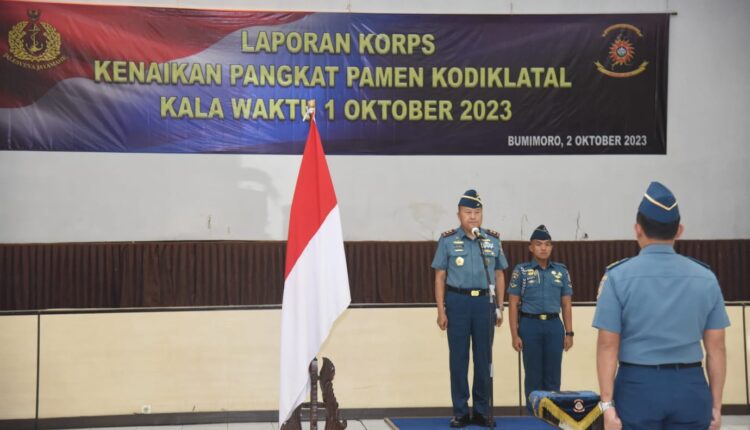 Surabaya, LNM – Menjadi kebanggaan keluarga, sebanyak 14 Perwira Menengah (Pamen) Komando Pembinaan Doktrin Pendidikan dan Latihan Angkatan Laut (Kodiklatal) akhirnya resmi menyandang pangkat baru setelah diresmikan dalam upacara kenaikan pangkat periode Oktober 2023 oleh Wadan Kodiklatal Laksda TNI Supardi mewakili Dankodiklatal Letjen TNI Marinir Suhartono, bertempat di Gedung R.E. Martadinata Kodiklatal, Bumimoro Surabaya. Senin, (02/10/2023).