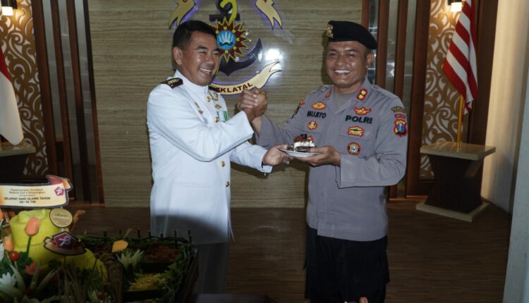 Surabaya, LNM – Sebagai wujud sinergitas dan soliditas TNI – Polri di wilayah Surabaya, Komandan Detasemen Markas Komando (Dandenmako) Kodiklatal Kolonel Marinir Pujiono mewakili Komandan Kodiklatal Letjen TNI Marinir Suhartono menerima kedatangan Kasat Pam Obvit AKBP Mujito yang mewakili Kapolrestabes Surabaya Kombes Pol Pasma Royce untuk memberikan ucapan “selamat ulang tahun TNI ke-78”, bertempat di Lobi Ki Hadjar Dewantara Mako Kodiklatal, Bumimoro Surabaya. Kamis, (05/10/2023).