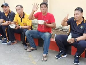 Berkumpul nya tukang becak ojol dan masyarakat sekitar polsek simokerto ini karena dipanggil oleh anggota kepolisian untuk ikut menikmati sarapan pagi.
