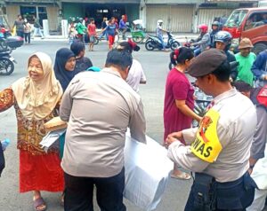 Petugas kepolisian polsek simokerto Polrestabes Surabaya ini membagikan makanan sebanyak 100 kotak dan diberikan ke warga juga ke pengendara yang melintas seperti ojek online, tukang becak, jukir dan sopir truk.