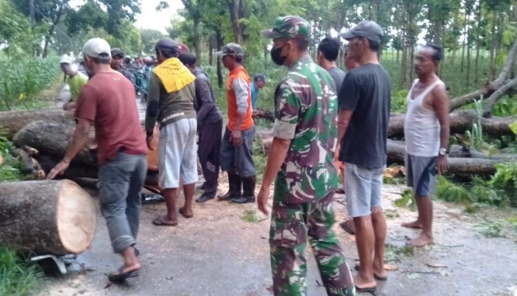 Alhasil tumbangnya pohon tersebut mengundang kesigapan dari sejumlah pihak, salah satunya Babinsa Bluluk, Sertu Agus yang langsung terjun ke lokasi kejadian.