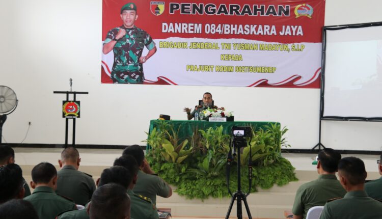 Sumenep, LNM – Danrem 084/BJ Brigjen TNI Yusman Madayun, S.I.P. memberikan pengarahan kepada prajurit Kodim 0827/Sumenep. Brigjen TNI Yusman Madayun menekankan netralitas TNI pada gelaran Pemilu pada 14 Februari 2024 mendatang.