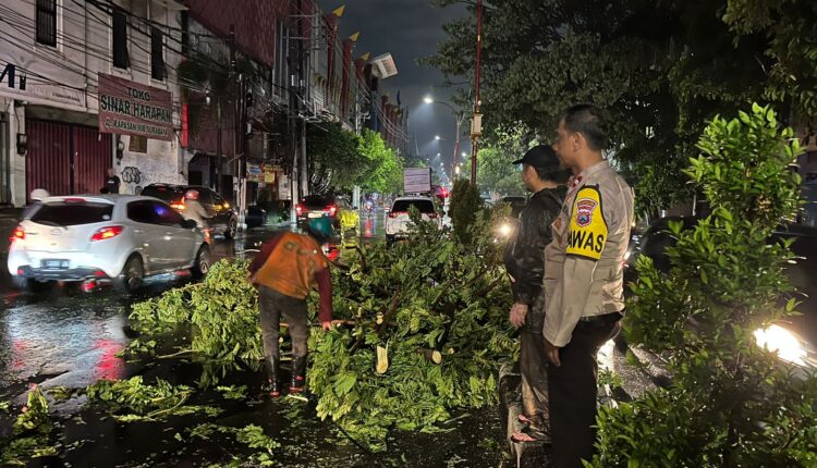 Polsek Simokerto Gercep Selamatkan Pengemudi Mobil Tertimpa Pohon Akibat Hujan Lebat