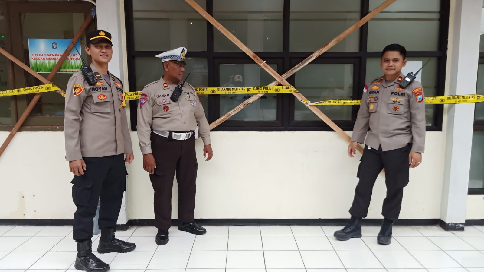 Foto : Kapolsek Simokerto Kompol Moh. Irfan didampingi Iptu Dwi Ady M dan anggotanya usai melakukan pemasangan garis police line dan penutupan jendela gudang logistik kecamatan simokerto