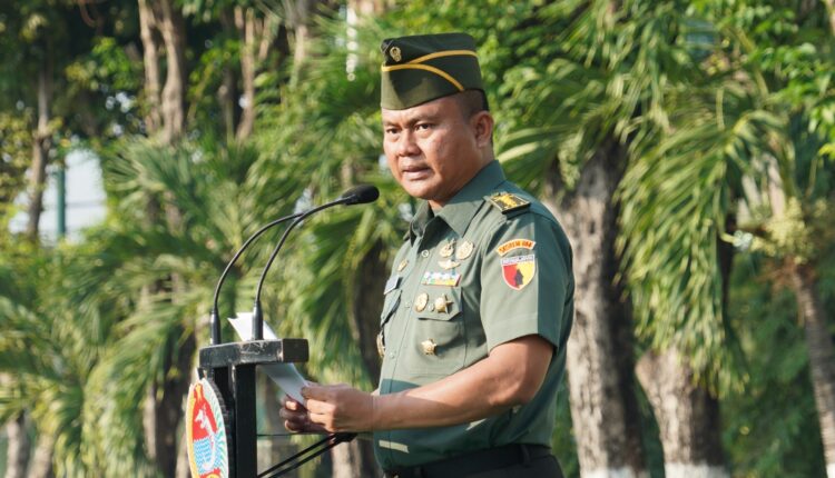 Surabaya, LNM – Kepala Staf Korem (Kasrem) 084/Bhaskara Jaya Kolonel Inf Budhi Utomo, S.I.P. membacakan amanat tertulis Kepala Staf Angkatan Darat (Kasad) Jenderal TNI Maruli Simanjuntak, M.Sc. pada saat memimpin upacara bendera 17-an di lapangan apel Makorem 084/BJ jalan A. Yani No. 1 Surabaya, Senin (19/2/2024).