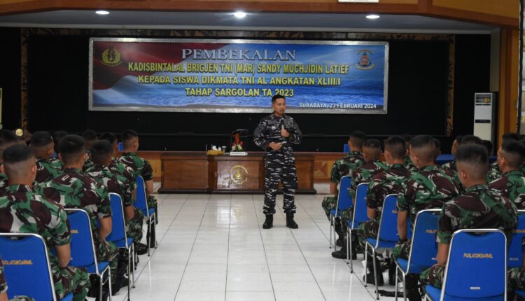 Surabaya, LNM – Guna wujudkan Prajurit Tamtama Muda yang berkarakter sebagai ujung tombak satuan TNI Angkatan Laut (TNI AL), untuk itu Kepala Dinas Pembinaan Mental Angkatan Laut (Kadisbintalal) Brigjen TNI Marinir Sandy Muchjidin Latief memberikan Pembekalan tentang Empat Pilar dan Strategi Disbintalal kepada 408 Siswa Pendidikan Pertama Tamtama (Dikmata) Kodikopsla dan Kodikdukum, Angkatan 43/1 TA. 2023, bertempat di Gedung Moeljadi, Kodiklatal Bumi Moro Surabaya, Jumat (23/02/2024).
