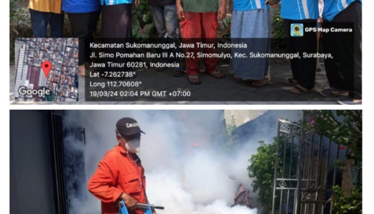 Surabaya, LNM – Antisipasi berkembangnya jentik jentik nyamuk di lingkungan Kampung Simo Pomahan Baru, kecamatan Sukomanuggal, Ketua RT bersama KSH melaksanakan kegiatan Fogging di rumah rumah warga pada Selasa (19/03/24) sekira pukul 13.00 Wib, bertempatan di wilayah RW 05.