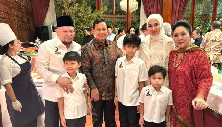 Jakarta, LNM – Ketua Dewan Perwakilan Daerah Republik Indonesia, AA LaNyalla Mahmud Mattalitti berserta istri dan anak, mendatangi open house di rumah Menteri Pertahanan RI yang juga Presiden Terpilih, Prabowo Subianto di Jalan Kertanegara 4, Kebayoran Baru, Jakarta Selatan, Rabu (10/4/2024) petang.