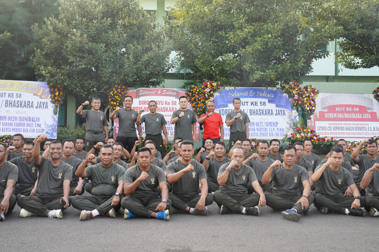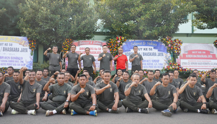 Surabaya, LNM – Momentum Hari Jadi Ke-58 Korem 084/Bhaskara Jaya tanggal 2 Agustus 2024, pada pagi hari ini di lingkungan Makorem 084/Bhaskara Jaya, bertempat di lapangan apel digelar kegiatan olah raga bersama yang diikuti oleh seluruh prajurit Makorem, Jum’at (2/8/2024).
