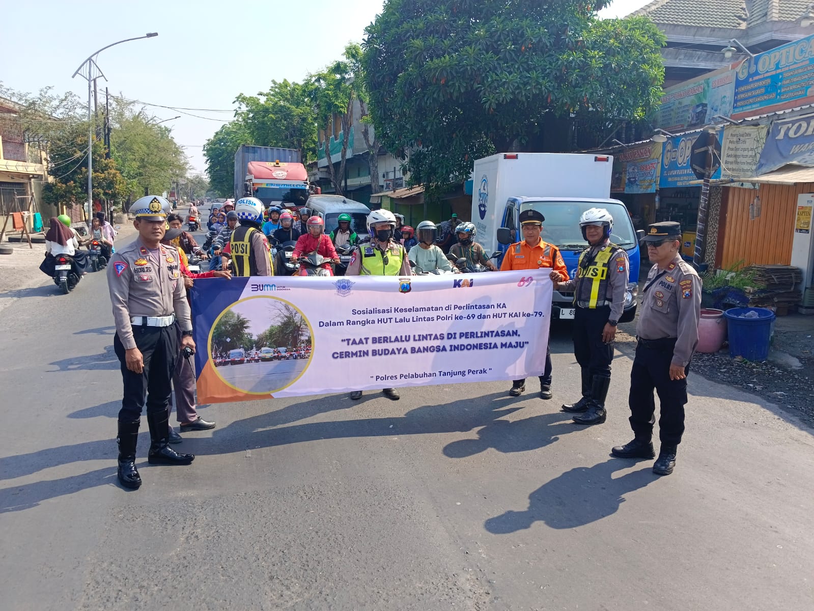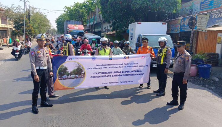 Sambut Hari Lalu Lintas Bhayangkara ke-69, Satlantas Polres Pelabuhan Tanjung Perak dan PT KAI Daop 8 Gencar Sosialisasi Keselamatan di Perlintasan Sebidang