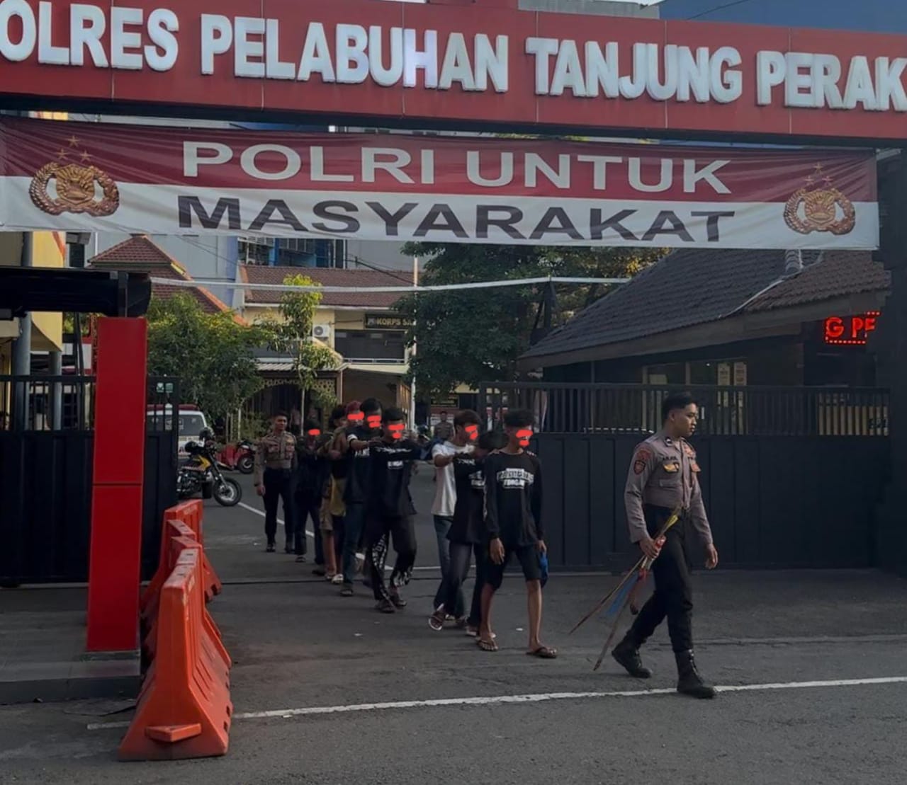 Sebanyak 11 remaja ala gengster diamankan ke Polres Pelabuhan Tanjung Perak dengan berang bukti dua buah sajam, sebuah ketapel, 1 alat panah, 10 handphone, serta 3 unit sepeda motor.