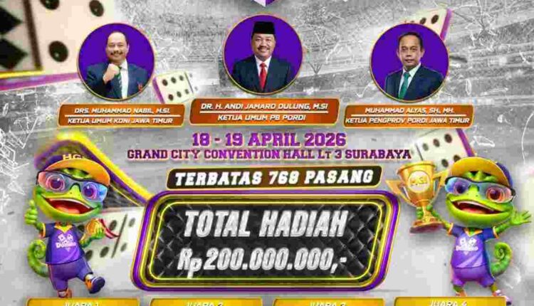 Surabaya, LNM – Pengurus Provinsi Persatuan Olahraga Domino Indonesia (PORDI) Jawa Timur akan menggelar turnamen domino berskala nasional pada 18–19 April 2026 di Grand City Convention Hall lantai 3, Surabaya. Ajang ini ditargetkan diikuti sekitar 500 pasangan atau setara 1.000 peserta dari seluruh Indonesia.